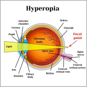 In Hypermetropia (long sightedness), the eye is shorter than normal or the cornea is too flat, so that light rays focus behind the retina. Light rays from close objects such as pages of a book cannot be focused on clearly by the retina. Someone with hypermetropic eyes may find their vision is blurred when looking at objects near to them, and for vision to be clearer when looking at far away objects. Placing a plus powered (convex) lens in front of a hypermetropic eye allows the image to be moved forward allowing for correct focus on the retina.
